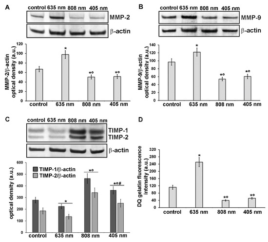 Analysis of the expression and activity of MMP-2 and MMP-9 and of the expression of their inhibitors, TIMP-1 and TIMP-2, in NIH/3T3 fibroblasts 24 h after cell exposure to red (635 nm), NIR (808 nm) and violet-blue (405 nm) PBM. Cells not subjected to PBM treatments served as control. (A-C) Representative blots of western blotting analysis of (A) MMP-2 (72 KDa), (B) MMP-9 (82 KDa), (C) TIMP-1 (26 KDa) and TIMP-2 (21 KDa). The densitometric analysis of the bands normalized to β-actin (42 KDa) are reported in the histograms. (D) Gelatinase assay. NIH/3T3 fibroblasts were seeded on a fluorescein-labeled gelatin substrate (DQTM gelatin). DQTM gelatin fluorescence signal intensity (515 nm), resulting from the digestion of the gelatin by MMPs’ activity, was quantified by a spectrophotometer. Significance of difference in A: * p < 0.01 vs. control; ○ p < 0.01 vs. 635 nm; p = 0.6, 405 nm vs. 808 nm. Significance of difference in B: * p < 0.01 vs. control; ○ p < 0.01 vs. 635 nm; p = 0.59, 405 nm vs. 808 nm. Significance of difference in C: * p < 0.01 vs. relative control; ○ p < 0.01 vs. relative 635 nm; # p < 0.01 vs. relative 808 nm. Significance of difference in D: * p < 0.01 vs. control; ○ p < 0.01 vs. 635 nm; p = 0.26, 405 nm vs. 808 nm.