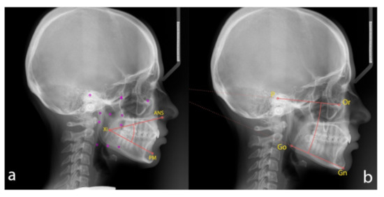 Cephalometric analysis: (a) The lower facial height angle [LFHˆ], between anterior nasal spine [ANS], [Xi] point and prementon [PM]; (b) The angle [MLˆFH], between mandibular plane (gnathion [Gn]–gonion [Go]) and Frankfurt plane (porion [P]–orbitale [Or]).