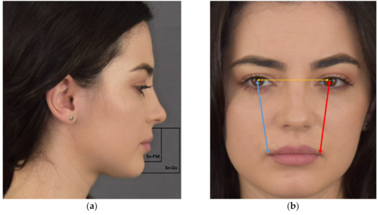 For the anthropometric facial measurements, each subject was asked to sit in an erect forward position with an unsupported head. Three readings have been made for every subject, between four groups of specific standard points (Figure 2a,b):