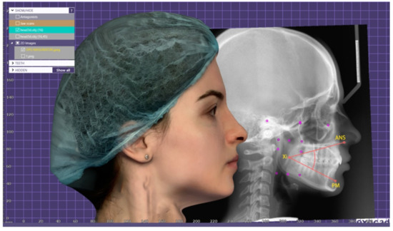 Facial scans .obj files and the corresponding cephalometric files with lower facial height angle and [ANS], [Xi] and [PM] landmarks marked, saved as dicom files, were imported in Exocad® DentalCAD, version 2.3 Matera software (Exocad GmbH, Darmstadt, Germany) and superimposed using best fit algorithm (Figure 3).