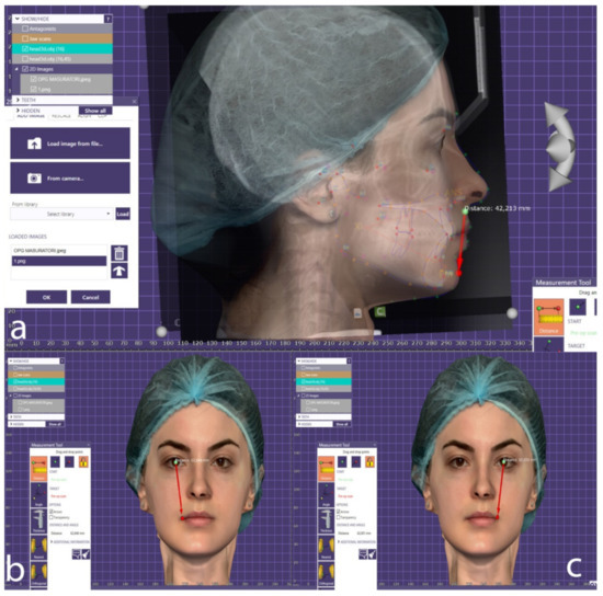 The anthropometric measurements with teeth in maximum intercuspal position: Sn–PM, Sn–Gn, Pu–Ch_r and Pu–Ch_l were done in Exocad on facial scan files (Figure 4a–c). For the lateral measurements, the cephalometric landmarks obtained through the superimposed files were used to mark the corresponding anthropometric landmarks (Figure 4a).