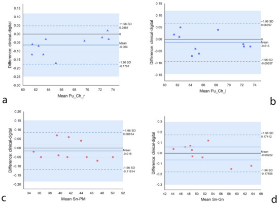 The agreements evaluations between the four groups of anthropometric measurements using the digital caliper (clinical) and their corresponding measurements on facial scans in Exocad software (digital) are presented in Figure 5a–d.