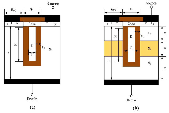 In order to achieve the desired charge-coupling, the split-gate electrode within the oxide coated trenches is designed to connect the source during operation in the blocking mode, as shown in Figure 1. The cross-sectional view of the HDSGRSO UMOSFET is presented in Figure 1b. Conventionally, the doping concentration of the n-drift is uniform. In this study, the epitaxial layer of HDGRSO UMOSFET has been divided into three parts with different doping concentration and thickness: the upper, the middle and lower epitaxial layers. The middle epitaxial layer has a higher doping concentration compared with the upper and lower epitaxial. In order to emphasize the modulation effect of the high doped epitaxial layer on the electric field, the doping concentrations of the upper and lower epitaxial layers are set to same, and the thickness of the high doped epitaxial layer is L2.