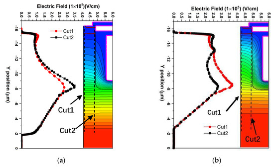 In this work, we used the TCAD to compare the performance of two structures. The potential contours and the electric field distribution along the trench surface (cut2) and in the middle of Mesa active area (cut1) for two structures at VDS = 240 V are represented as shown in the Figure 2. The doping concentration of the n-drift (ND and N2) was 1 × 1015/cm−3 and 5 × 1015/cm−3 for SGRSO and HDSGRSO UMOSFET, respectively, and the doping concentration of the high doped epitaxial layer was 1.5 × 1016/cm−3. It can be seen from the picture that the potential lines originally concentrated on the lower part moves to the upper part of the n-drift region, and the electric field of HDSGRSO UMOSFET distribution was more uniform than that of SGRSO UMOSFET. Furthermore, a small electric field peak appeared at the interface between the upper and the middle epitaxial layers, as shown in Figure 2, at −13.5 μm in the y-axis. Therefore, the high doped epitaxial layer can modulate the electric field distribution and reduce the internal high electric field to improve the BV.