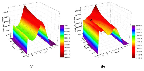 Figure 3 shows the three-dimensional view of the electric field distributions for two structures with the same n-drift doping concentration (ND and N2) 5 × 1015/cm−3. The small electric field peak (at point A) brought by the high doped epitaxial layer is shown in the Figure 3b. It is obvious that the electric field in the drift region of HDSGRSO UMOSFET is more uniform than that of the SGRSO UMOSFET at the same n-drift doping concentration, and the volume under the electric field curved surface of HDSGRSO UMOSFET is bigger contrast to the SGRSO UMOSFET. As a result, the BV of HDSGRSO UMOSFET is 240 V, while that of SGRSO UMOSFET is 190 V.