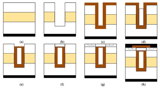 Fabrication procedure of the HDSGRSO UMOSFET.(a) Epitaxial layers are formed, (b) Trench is opened, (c) Thick oxide is deposited, (d) Polysilicon is deposited and etched back, (e) Thick oxide is deposited and etched back, (f) Gate oxide and gate poly are formed, (g) The p-body and n+ source region are formed, (h) Thick oxide and source metal are deposited.