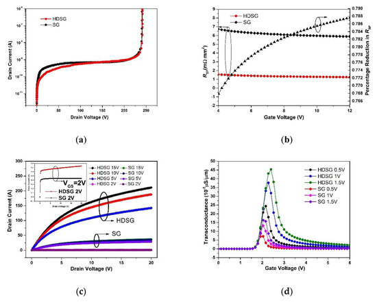 Drain I-V characteristics: (a) Breakdown Voltage (BV); (b) RSP at different gate voltage with VDS = 0.3 V and percentage reduction in RSP as compared with the SGRSO UMOSFET; (c) output characteristics and (d) transconductance of two structures.