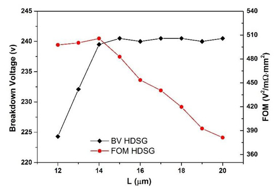 Figure 7 shows the BV and FOM (BV2/RSP) at different thicknesses of the drift region. It indicates that there exists a saturated BV at a certain thickness. When the L is 14 μm, the FOM value and BV reaches the optimal value, respectively, and the BV is about 240 V. With the increase of epitaxial thickness, the RSP gradually increases, resulting in the decrease of FOM. The L is 14 μm for HDSGRSO UMOSFET, whereas the L’ is 16 μm for SGRSO UMOSFET when the BV is 240 V. Because of the enhancing of the electric field by high doped epitaxial layer, the breakdown occurs before the n-drift is depleted completely. Therefore, it can reduce the thickness of the epitaxial layer and RSP. As a result, the FOM has been increased by 464% as compared with the SGRSO UMOSFET when the BV is about 240 V, according to the simulation results.