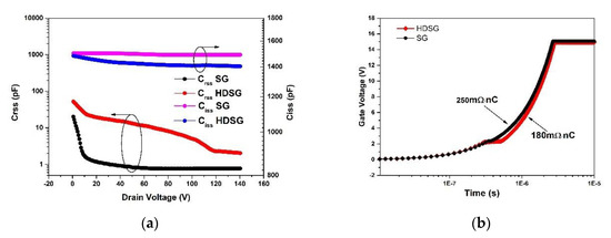 The Crss and Ciss (BV2/RSP) at different drain voltage (a) and (b) comparison of gate charge and RSP × Qgd for HDSGRSO and SGRSO UMOSFETs.