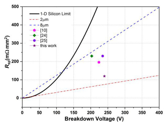Table 2 shows the switching time and switching energy loss of two structures at 120 V, 4 A. The HDSGRSO UMSOFET has a lower turn-on delay time (td(on)) because of the smaller input capacitance, however, the rise time(tr) of the HDSGRS UMOSFET is slightly higher due to the larger Crss, which causes results in the turn-on loss (Eon) to be very close. On the other hand, the lager Crss causes a certain increase of the turn-off delay (td(off)) time and fall time (tf), which leads to an increase of turn-off loss (Eoff) in contrast to the SGRSO UMOSFET, and this needs more research in the future. The performance of the HDSGRSO UMOSFET has been compared with the one-dimensional silicon limit and other works in Figure 9. The HDSGRSO UMOSFET has the lowest RSP and the highest BV compared with the previous power UMOSFETs.