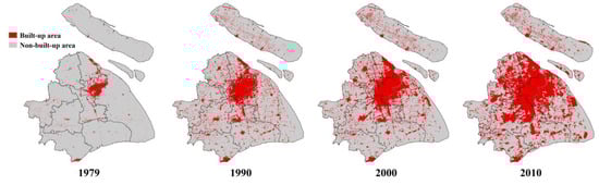 LULC data were obtained from Landsat satellite images for four periods (i.e., 1979, 1990, 2000 and 2010) from the USGS (https://earthexplorer.usgs.gov/). Table 2 shows the image details for the four periods. After atmospheric and geometric correction, these images were further classified into built-up and non-built-up areas based on a supervised classification method. The non-built-up area included four land use types: farmland, green land, bare land and water (Table 3). The classification results show that the total accuracy is higher than 85% and the values of the Kappa coefficient (a measure of agreement between the two individuals, see Yin et al. [59]) are between 0.79 and 0.89. Figure 2 shows the spatiotemporal distribution of the built-up and non-built-up areas. In this period (1979–2010), Shanghai experienced rapid urbanization and the extent of built-up area in 2010 reached 2350.05 km², which is nearly 10 times than that in 1979.