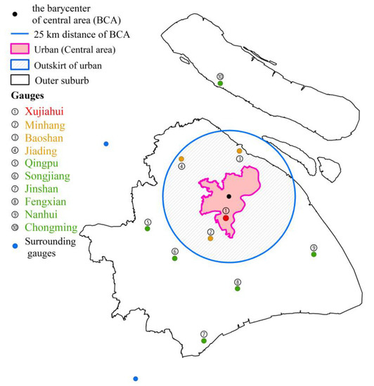Based on the 25-km distance of the barycenter of the central area, the investigated area could be classified into three categories: urban area (Ur), outskirt of urban area (OUr) and outer suburb area (OS) (see Figure 3). Daily rain gauge-based precipitation observations from January 1979 to December 2010 were obtained from the Shanghai Meteorological Bureau (http://sh.cma.gov.cn/). As shown in Figure 3, Xujiahui gauge (red dot) is located in the Ur region. Minhang, Baoshan, Jiading and Songjiang gauges (orange dots) are distributed in the OUr region (the distance of the barycenter of the central area is less than 25 km). In addition, other gauges (e.g., Qingpu, Jinshan, Nanhui and Chongming gauges) are positioned in the OS region, which are far from the city center (distance of the barycenter of central area is more than 25 km).