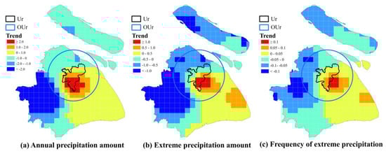 Spatial distribution of the gridded mean annual precipitation in Shanghai during the period 1979–2010 is shown in Figure 5. The precipitation in the Ur and southern OUr is higher than in other areas, with an average annual precipitation of over 1700 mm/year. The relatively low average annual precipitation is located on Chongming Island and the western areas. Figure 6 shows the spatial distributions of the trend for annual precipitation amount, extreme precipitation amount and frequency of extreme precipitation. It is evident that most of the Ur region had an upward trend with respect to the annual and extreme precipitation from 1979 to 2010. The annual precipitation amount exhibited a decreasing trend for most of the OUr and OS regions. We found that regions with an upward trend for extreme precipitation amount and its frequency are mainly distributed over the eastern region of the study area (Figure 6b,c).