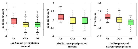 Figure 7. Box plots of the precipitation trends during 1979–2010 for Ur, OUr and OS. The rectangular box plot shows three horizontal lines that represent the median (intermediate line), the 25th percentile (low line) and the 75th percentile values (upper line), while the top and bottom three vertical lines represent the maximum and minimum of the precipitation changes during 1979–2010 for Ur, OUr and OS, respectively. (a) annual precipitation amount; (b) extreme precipitation amount; and (c) frequency of extreme precipitation.