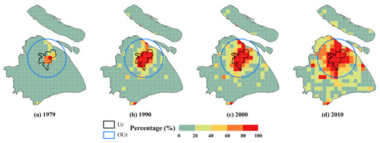 Based on Equations (1) and (2), we calculated the percentage changes of the built-up areas given the selected four periods. As shown in Figure 8, in 1979, most of the built-up areas were primarily located in the central area of Shanghai. From 1990, the built-up areas have expanded throughout the Ur region of Shanghai, and some new built-up areas have been established around the OUr region. Since 2000, there has been an expansion of the built-up areas to the OS region. In 2010, the percentage of built-up areas in OS region exceeded 20%. Overall, from 1979 to 2010, it is noted that the fastest areas of expansion are located in the OUr region (Figure 9). The grids with higher change rates of the built-up area are mainly distributed in the OUr region, e.g., within the 25 km distance of the barycenter of the central area. The OS region, far away from the central area, has a relatively lower changing rate.