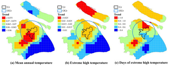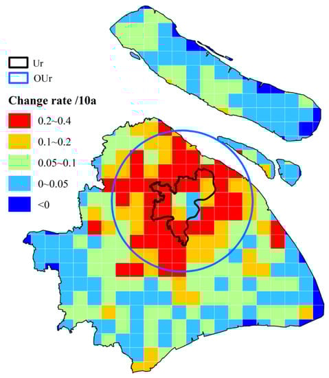 The spatial pattern of mean annual temperature indicates that areas with an upward change trend are mainly distributed over the Ur and OUr regions (Figure 13a). Urbanization and LULC changes may contribute to the spatial distribution difference of the evolution trends of temperature in Shanghai. The largest rise in mean annual temperature occurs in the southwest of OUr, where the change rate of built-up area percentage is the highest. However, it is noted that most of the Chongming Island and northern OUr region had an upward trend with respect to the extreme high temperature and days of extreme high temperature from 1979 to 2010 (Figure 13b,c).