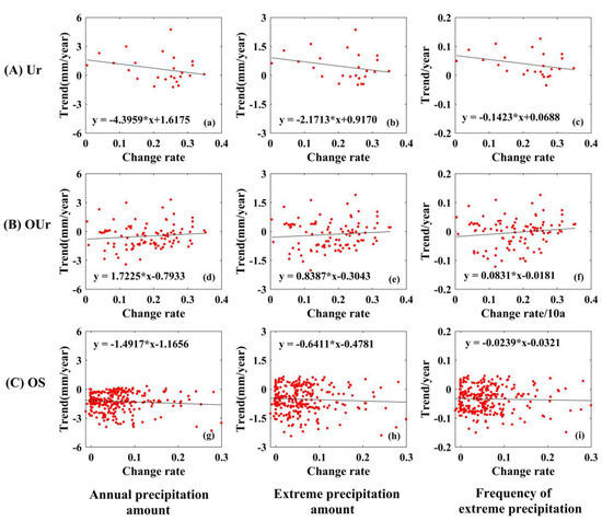 Figure 10. Scatter plots of the precipitation trend and changes in the rate of built-up area percentage for: the (A) Ur; (B) OUr; and (C) OS regions.