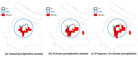 Spatial distributions of the blocks that exhibit an upward precipitation trend and the rapid built-up area changes (the change rate of built-up area percentage exceeds 0.2, red filled) are shown in Figure 11. These blocks are mainly distributed in the OUr region. In contrast to the circular distribution surrounding the Ur region for the frequency of extreme precipitation, annual precipitation amount and extreme precipitation amount are concentrated in the south of the Ur and OUr regions.