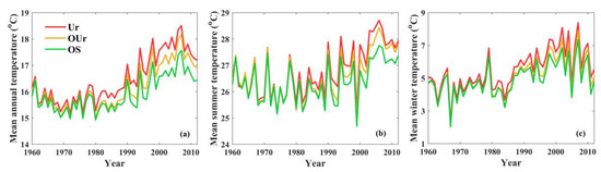 Due to the physical mechanism and thermal modifications of the urban boundary layer, this causes the city center to be warmer than the surrounding rural areas. This phenomenon as termed the UHI effect [90,91,92]. Figure 12 shows the time series of temperature in Shanghai from 1960 to 2010 based on in situ observations. It is evident that mean annual temperature, mean summer temperature, and mean winter temperature recorded at stations located in the Ur, OUr and OS regions generally exhibit an upward trend from 1960 to 2010. From the 1960s to the early 1980s, the temperature and change trends among those three regions are relatively synchronized. However, from the mid-1980s, the observed annual average temperature differences gradually become more prominent due to rapid urbanization. The temperature of Ur becomes gradually higher than measurements from the gauges distributed in OUr and OS. As previously indicated, associated with the expansion of the built-up area, the central area has a relatively high degree of built-up area percentage, which inevitably increases the impervious surface cover with its high heat capacity. Therefore, the quantitative relationship between the temperature and the changing rate of the built-up in the Ur, OUr and OS regions during 1979–2010 is further discussed.