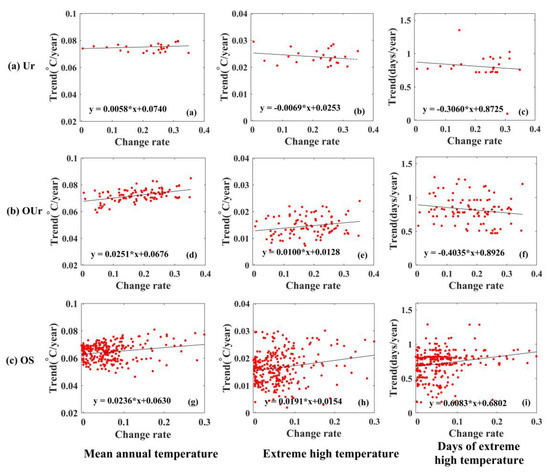 Figure 14. Scatter plots of temperature and change rates of built-up area percentage for: the (a) Ur; (b) OUr; and (c) OS regions.
