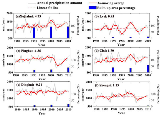 Figure 15. The time series and estimated trends for annual precipitation amounts from 1979 to 2010 and the percentage of the built-up area from 1990 to 2010 for: (a) Xujiahui; and five coastal sites ((b) Lvsi; (c) Pinghu; (d) Cixi; (e) Dinghai; and (f) Shengsi).