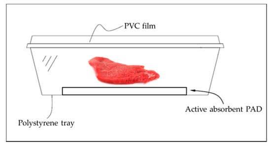 In order to evaluate the efficacy of the pad during the shelf life of the meat, it was placed on the base of the trays and it was suitable for storage and food contact (Figure 1). The pad size was 7.5 × 15 cm.