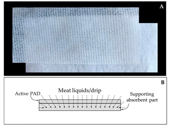 Active absorbent pad (A) and scheme of the pad architecture (B).