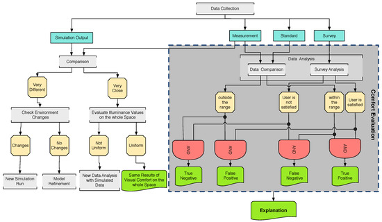 In this work, we propose a new methodological approach, which, addressing the drawbacks mentioned above, extends the approach proposed in [26], where a method for reaching comfort conditions was presented. The need to improve such an approach comes from retrieving information given by highly fluctuating parameters both in space and in time, such as the illuminance. Moreover, the users’ consciousness and their acceptance of supporting technology were further enhanced by giving a comprehensive explanation during the interaction, transforming the traditional POE approach into Explainable POE (EPOE). Notably, the explanation is based on four kinds of possible results: (1) False Positive (FP): the environment does not comply with the standard, and the user feels good; (2) True Negative (TN): the environment does not comply with the standard, and the user does not feel good; (3) False Negative (FN): the environment complies with the standard, and the user is not feeling well; and finally (4) True Positive (TP): the environment complies with the standard, and the user feels good.