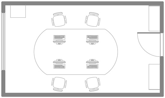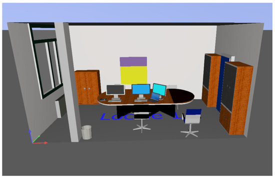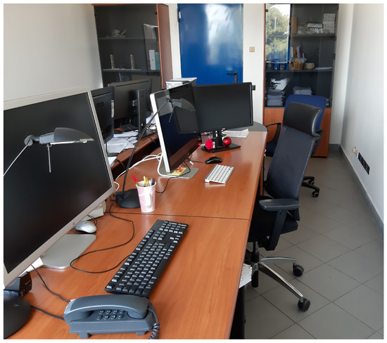 The real image of the office under study is shown in Figure 4. The large window is equipped with white drapes, whose transmission factor is equal to 0.70. It is exposed to west. The office is equipped with: a big painted wooden desk ( where r is the reflection coefficient) with a small portion painted black located in the middle of the room; two painted wood cabinets () equipped with glass doors (), located almost symmetrically with respect to the door; a small painted wood cabinet () at the end of the opposite wall; and four chairs made of blue and black material (). The door of the room is made of steel painted blue (). The work-plane of the participant for the test is equipped with two desktop PCs with three big monitors. Moreover, usually, a laptop is positioned under the first monitor.