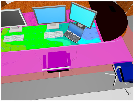 The digital model of the office shown in Figure 5 was implemented in the software Dialux Evo. All the optical characteristics of the surfaces of the room were implemented in the model. Furthermore, a maintenance factor of 0.8 was set. To perform the daylight simulation, an hour of a day and the sky conditions (http://www.cie.co.at/publications/cie-standard-overcast-sky-and-clear-sky) were selected. Some simulations were performed at different hours of the day. A calculation surface was positioned at the height of 0.75 m from the floor (see Figure 6). This comprehends the whole area of the work-plane available for the user. The portion of the desk behind the first monitor (i.e., black semicircle on the right) was not considered due to its irregular form, which resulted in being uncomfortable for the user.