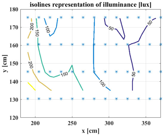 Figure 7 shows the isolines of the illuminance values calculated by the simulation software. It is a 2D representation of the values shown in Figure 6.