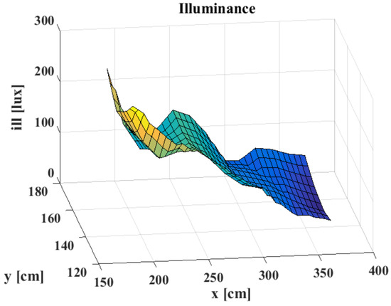As can be noticed, the obtained values decreased significantly from the points near the window towards those near the door (i.e., far from the window). This is more evident considering the 3D representation of the illuminance in Figure 8, where a variation in the y coordinate can be appreciated. This situation always occurs during the day since it is tied to the position of the window. Moreover, during the day, the illuminance values compliant with the technical standard EN12464 are only rarely achieved at some points.