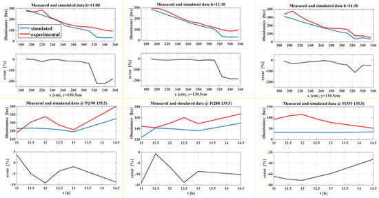 In the diagrams depicted in Figure 9, the simulated illuminance values are compared with some experimental values to assess the accuracy of the results. They show a variation throughout space and time. In particular, they refer to the values of the illuminance (simulated and real ones) of the office taken on 4 December 2019. Both simulations and the acquisition of the real data were performed with the artificial light off, the door closed, and the window drapes open. The first and the second data acquisition were performed at 11:00 a.m. and 12:30 a.m.when the sky was clear. Instead, during the third acquisition at 2:30 p.m., the sky was cloudy. The simulation was run by setting the same time when the measurements were taken and the same sky conditions.