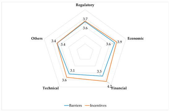 In accordance with Section 2.1, technical is the smallest barrier from the perspective of interviews and the remaining barrier typologies are at the same level. Some considerations regarding the priority of economic and financial issues, as mentioned in Section 2.1, can be deduced from the average values. Finally, by comparing incentives and barriers it can be expected that the higher the difference between a barrier and its corresponding incentive, the more urgent the need to develop corresponding strategies. This confirms that financial, economic, and technical factors still need to be addressed.