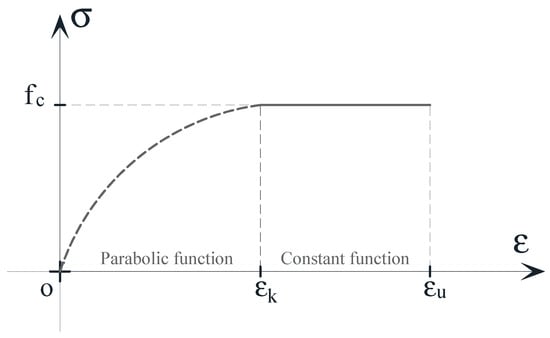 In this section, the constitutive law of the materials (such as masonry and FRCM) adopted for the structural analysis are defined. From the scientific literature, several stress–strain constitutive relationships can be used to describe the mechanical behavior of masonry [31]. One of the most adopted models for compressive behavior, used for the presented analyses, is suggested by CEN Eurocode 6 [32], as shown in Figure 2. This model completely neglects the post-peak softening, considering a perfectly plastic post-peak behavior. The tensile behavior, on the other hand, can be described by elastic–brittle relationship, yet for the purposes of the present work, its contribution is negligible when the strengthening system is applied.