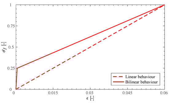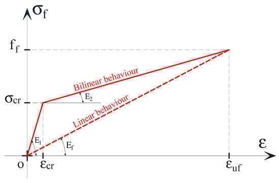 Composite materials are, by definition, made up of two or more materials known as phases. In FRCM composite materials, it is possible to differentiate exactly three phases: the fibrous phase, the mortar matrix phase, and the interface phase. Due to this mixed nature of the mortar matrix and fiber, the FRCM composite is characterized by various phenomena such as matrix cracking, slip, or debonding phenomena. However, it is possible to provide a general stress–strain relationship to simulate the behavior of the whole composite system to interpret the different factors that influence its behavior most. De Felice et al. [33] reported three different stress–strain relationships to simulate the behavior of composite systems in tension: linear, bilinear, and trilinear behavior. For the purposes of this work, only the linear and bilinear behaviors were compared to different behaviors between a classical FRP and FRCM with synthetic fibers, as shown in Figure 3. Moreover, the bilinear and trilinear relationships take into account several effects of the mortar matrix, such as the cracking, bond slip, or tension stiffening effect that are neglected by the linear behavior.