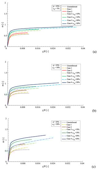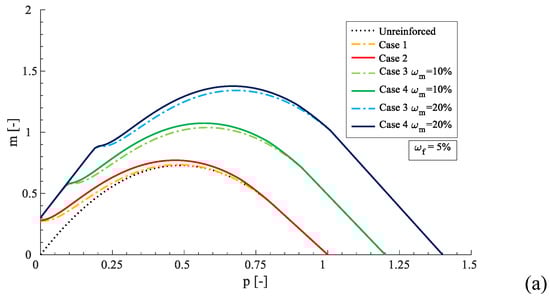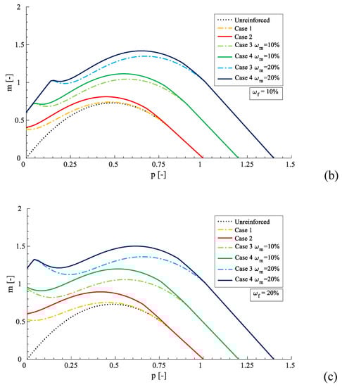 In order to have a good variability of the results, the mechanical compressed mortar matrix reinforcement the ratio (ωm) and mechanical fiber reinforcement ratio (ωf), which varied to define several p–m interaction domains. In this way, the influence the constitutive relationship of other parameters, such as the mechanical reinforcement ratios, were analyzed. Figure 7 shows the numerical results in terms of p–m interaction domains from case 1 to case 4 as the dimensionless parameters ωm and ωf change. The diagrams were grouped to fix the mechanical fiber reinforcement ratio, where ωf was equal to 5%, 10%, and 20% (Figure 7a–c, respectively).