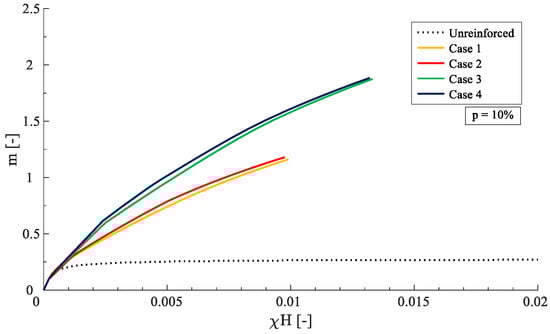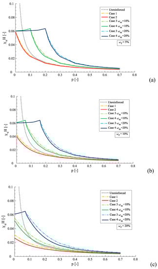 In Figure 8, it can be observed that the dimensionless curvature capacity (χH) of the strengthened cross section was clearly affected by the different relationships between the composite materials. When observing cases 1 and 2, it is clear which matches case is reinforced on one side, and which strengthening system increases the flexural capacity reduces the ultimate curvature and ductility. In other words, applying reinforcement only on the tension side tends to weaken the cross section, even though it is related to an increase in flexural capacity. The presence of the mortar matrix in compression conversely causes an increase of flexural capacity and increases the ultimate curvature (see cases 3 and 4). How much curvature can be recovered from the mortar matrix is to the mechanical fiber reinforcement ratio ωf. As such, the higher ωf is, the smaller the ultimate curvature is (see Figure 8), and thus the higher ωm is needed to recover the lost curvature capacity.