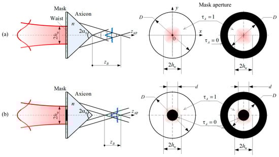 Let us consider the transformation of a Gaussian beam with field distribution Equation (1) by a binary mask and a refractive axicon with a refractive index and apex angle (Figure 1). In wave optics, the effect of an axicon is described by the complex amplitude transmittance []: , where is amplitude transmittance, is phase transmittance, is the numerical aperture of the axicon, is the angle of wavefront inclination to the optical axis after passing through the axicon in the case of the plane homogeneous wave.