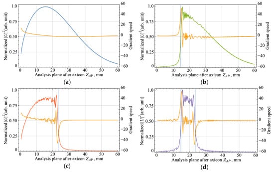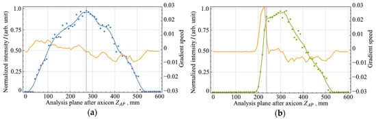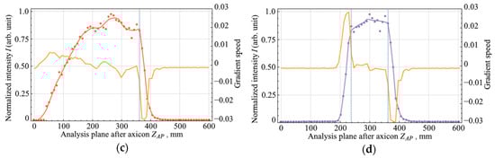 The analysis of the axial intensity distributions of the Bessel zone was carried out using the gradient of the scalar function, which shows the direction and rate of its most rapid increase/decrease [,]. In Figure 2, orange plots represent the value of the function gradient for each point in the analysis plane after the axicon. Based on the data, it follows that there was an abrupt change in the speed and direction of the gradient of the function.