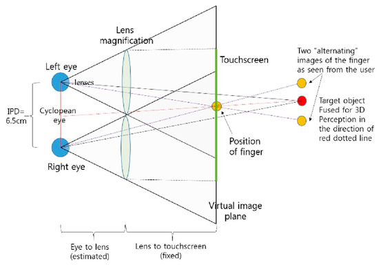 Figure 4 illustrates the workings of the Blurry Touch Finger. The touch screen is magnified into a larger virtual imagery by the lenses, and the 3D target object (red) is seen in focus, fused for 3D depth perception, in the direction of the purple dotted line (emanating from the mid- point between the two eyes (Cyclopean eye) by a phenomenon called the Allelotropia [