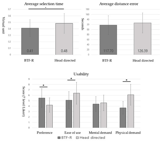 Selection performance (above) and usability (below) between BTF-R and head-directed methods. Note that higher score means more positive toward usability for the categories of preference and ease of use, and vice versa for mental and physical demand. The asterisk mark (*) indicates statistically significant difference.