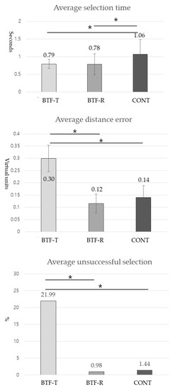Quantitative performance measures (average selection time, average distance error and average number of unsuccessful selections in percentage) among the three interface types. The asterisk mark (*) indicates statistically significant difference.