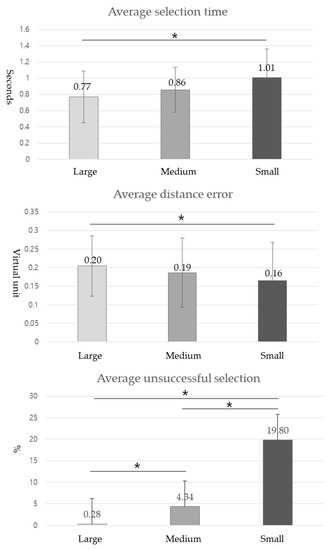 Quantitative performance measures (average selection time, average distance error and average number of unsuccessful selections in percentage) among the three target object sizes. The asterisk mark (*) indicates statistically significant difference.