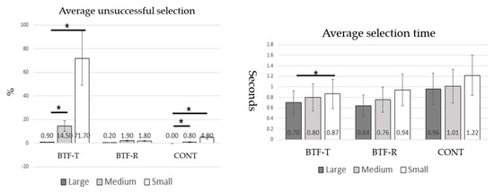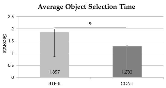 The average selection time between BTF-F and CONT with objects with sizes below 0.4 cm. The asterisk mark (*) indicates statistically significant difference.
