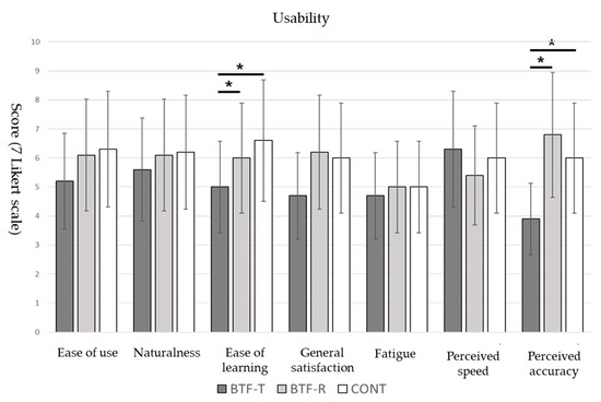 Responses to the survey which generally showed a similar level of usability among the three interface types. BTF-T was the least easy to learn, and perceived to be fast but less accurate. The asterisk mark (*) indicates statistically significant difference.