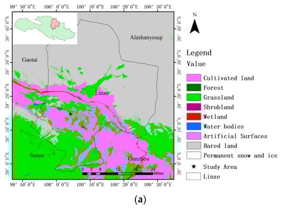 In Figure 1, the study area is located in Linze County in Zhangye, Gansu province, China. The central position is 39.250 43° N, 100.005 871° E, and the altitude is 1385 m. The land cover map is obtained from GLC30 [50].