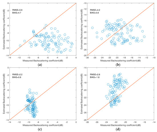 Backscattering coefficients calculated from the integral equation model (IEM) and calibrated integral equation model (CIEM) vs. the observations measured by synthetic aperture radar (SAR) at the C-band: (a) VV polarization, IEM; (b) VH polarization, IEM; (c) VV polarization, CIEM; (d) VH polarization, CIEM.
