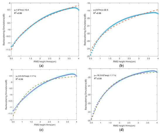CIEM simulations of the backscattering signal and Hrms, empirical correlation length lopt in different fitting relationships (logarithmic and exponential) in VV and VH polarizations: (a) VV, logarithmic; (b) VH, logarithmic; (c) VV, exponential; (d) VH, exponential.