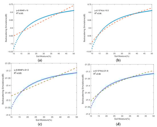 CIEM simulations of the backscattering signal with soil moisture in different fitting relationships (linear and logarithmic) in VV and VH polarizations: (a) VV, linear; (b) VV, logarithmic; (c) VH, linear; (d) VH, logarithmic.